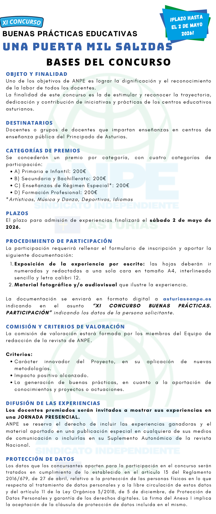 ANPE quiere apostar por los principios del esfuerzo, trabajo y la excelencia, convocando la VII Edición de su «CONCURSO ANPE DE BUENAS PRÁCTICAS EDUCATIVAS», en el que podrán participar todos los docentes que estén trabajando en centros educativos asturia